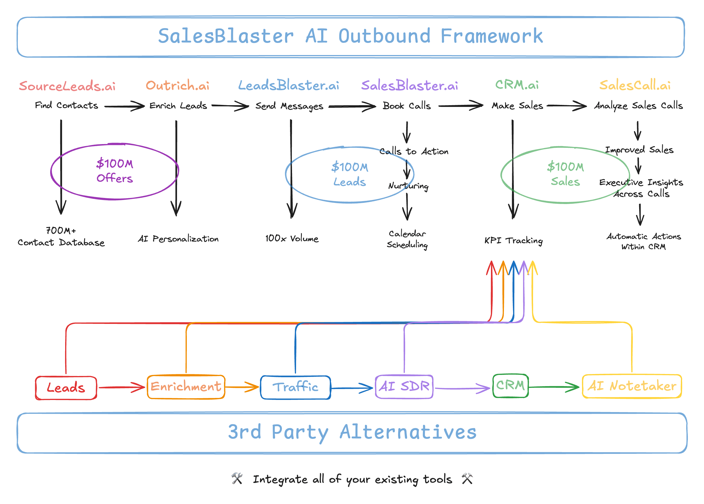 Growth and Scale plans include SalesBlaster Pro — 2,500 agent actions/month powering call intelligence, CRM automation, and the Darwinian Learning Loop on top of your outbound pipeline. Explore the platform →